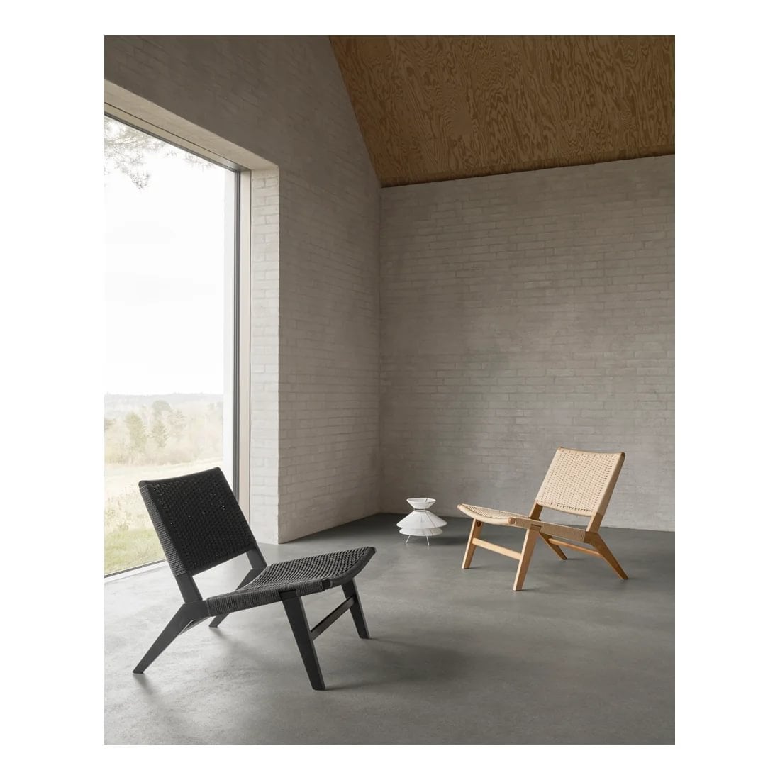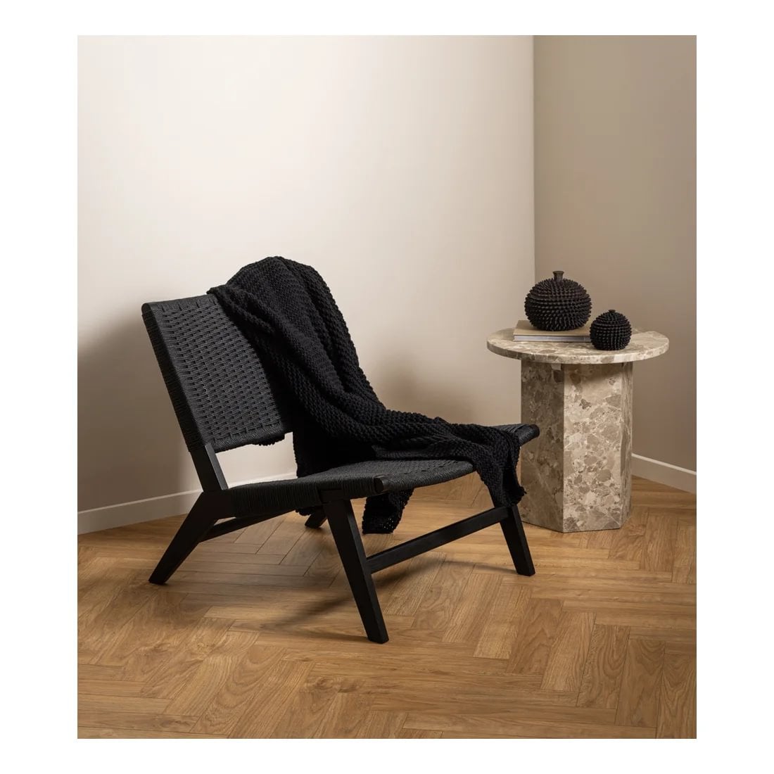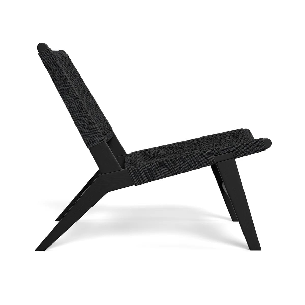 Fallegur hægindastóll með fléttuðu baki og sessu. Matt lakkaðir svartir eikarfætur.