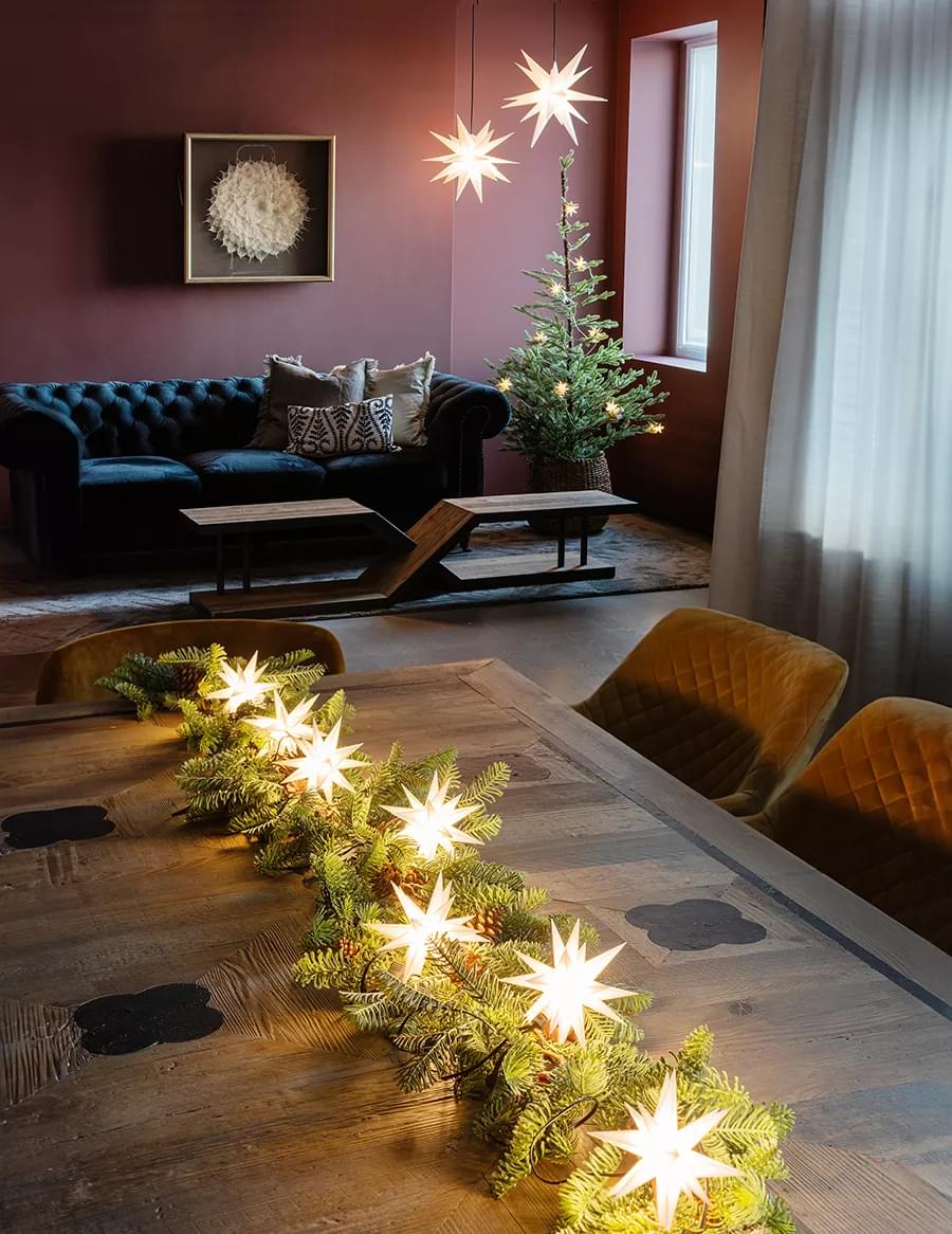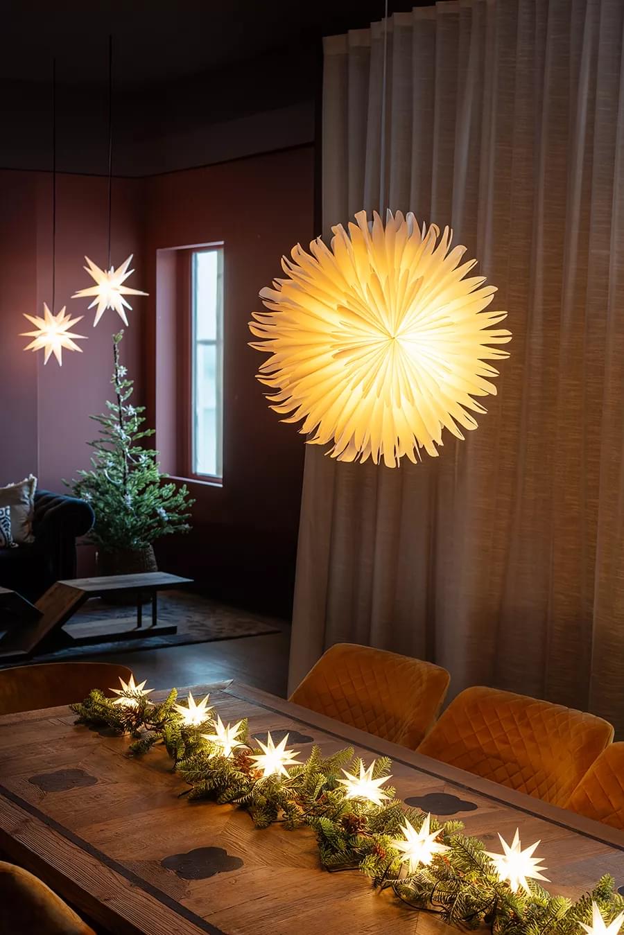 Stjarnan kemur í þremur stærðum, 65cm, 55cm og 40cm og einnig sem sería sem fallegt er að nota á jólatréð eða sem borðskreytingu.