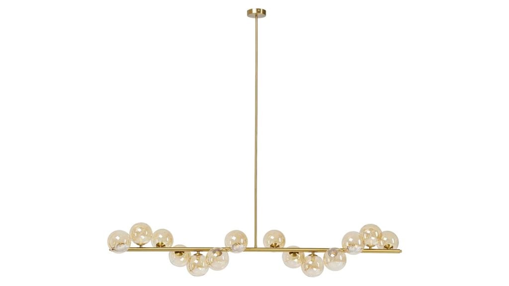 Ljósin speglast fallega í kúlum úr gleri og skapa hlýjan og dýnamískan ljóma í rýminu. Miðjan úr gylltu áli bætir við fágun og gerir ljósið að miðpunkti herbergisins, hvort sem það er í stofu, borðstofu eða yfir stiganum.