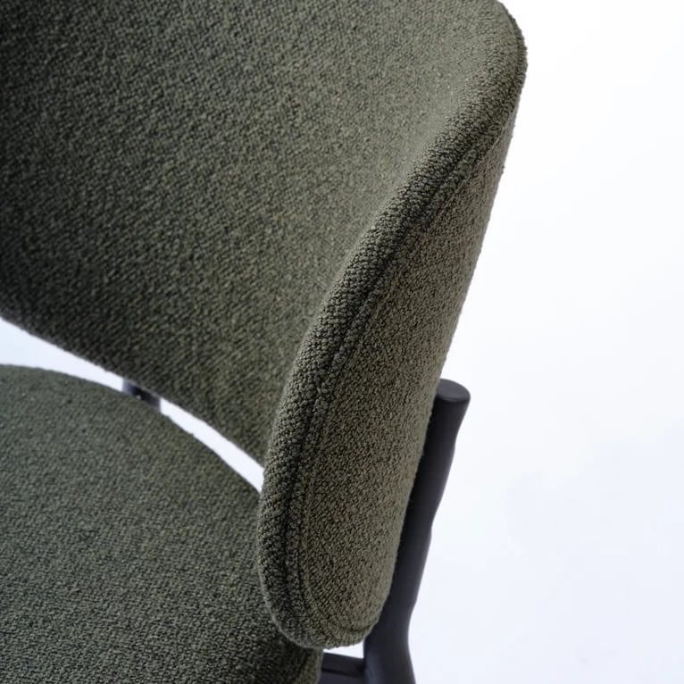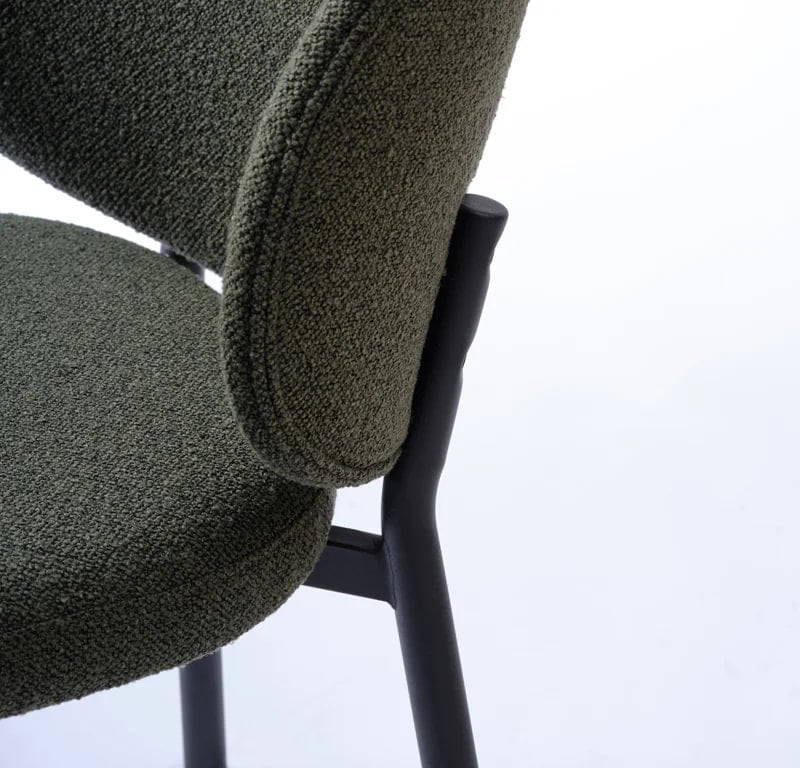 Swan borðstofustóllinn er nútímalegur og fágaður stóll klæddur mjúku Bouclé-áklæði sem fæst í fjórum litum. Hér er hann sýndur í grænu. Svartir málmfætur og mjúk bólstrun tryggja þægindi og stíl við öll tilefni.
